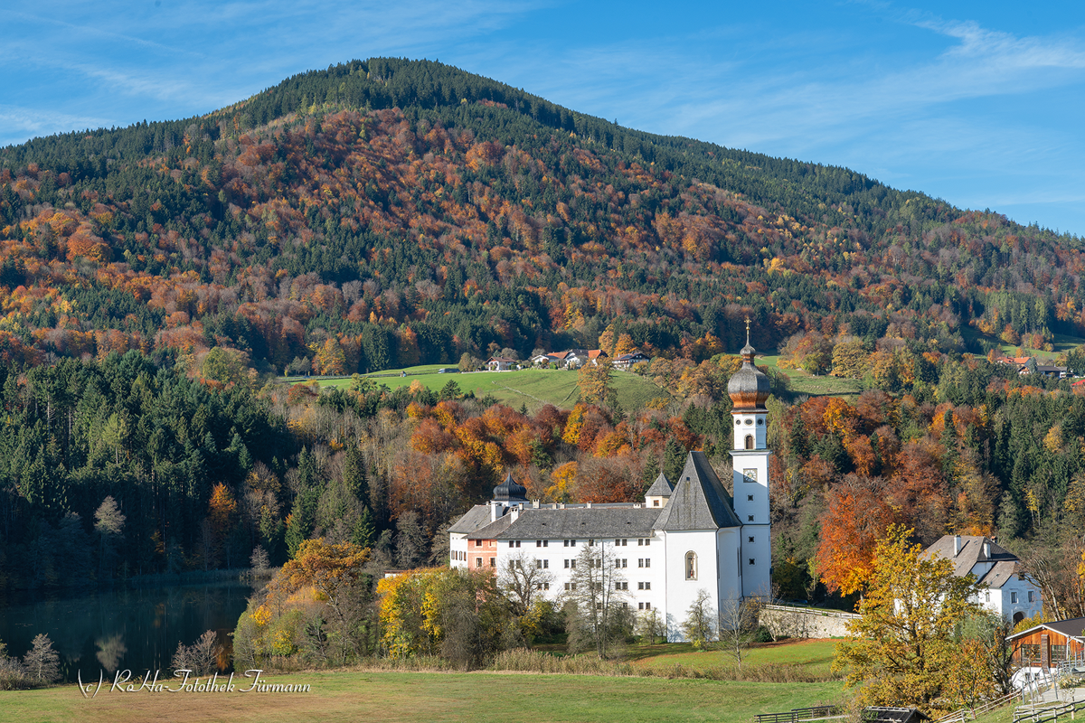 Das ehemalige Kloster liegt auf einer Halbinsel, die eine Landzunge in den Höglwörther See bildet. Tiefblau das Wasser des Sees, im Hintergrund die Berge des Voralpenlandes mit Hochstaufen und Zwiesel - ein Landschaftsmaler könnte nicht schöner sich sein Gemälde ersinnen, wie es hier die Natur und die Kultur als Wirklichkeit vorgibt.