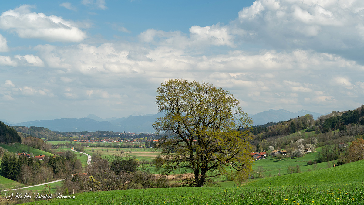 Der nördlichste Gipfelaufbau des Berchtesgadener Landes und zugleich der östlichste Gipfelaufbau der Chiemgauer Alpen – als beides zugleich sind die in ihrer Formation so harmonisch wirkenden Gipfel von Hochstaufen (1.771 m), Mittelstaufen (1618 m) und Zwiesel (1.782 m) in der Geographie festgehalten. Für die Fotografen kommt zum Bergmotiv das landwirtschaftlich geprägte, schon beinahe als Parklandschaft zu bezeichnende „Land vor den Bergen“ hinzu. Vom flach-sanfthügelig, von der letzten Eiszeit (der Würmeiszeit) vor ca 18 000 Jahren modellierten Land geht es über in die voralpinen, oft fast zur Gänze bewaldeten Hügel. Hochstaufen, Mittelstaufen und Zwiesel bilden dazu den mächtigen Hintergrund (auf dem Bild im späten, nochmal vom Schneefall in den alpinen Regionen geprägten Frühjahr – für Geübte(!) Bergsteiger zu empfehlen die komplette Überschreitung der drei Gipfel).